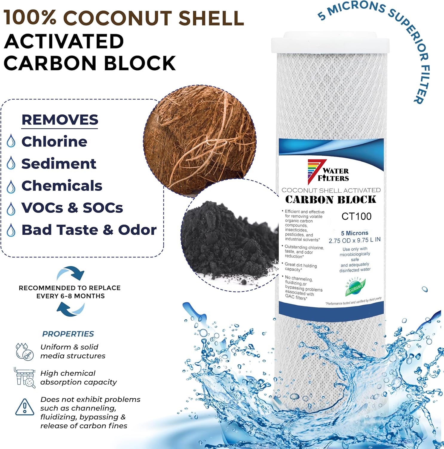 High quality coconut shell carbon removes levels of Chlorine, Organic Compounds, Pesticides, Herbicides and more. 5 Micron rated particulate filtration also removes levels of rust, dirt, sand and sediment particles larger than 5 Microns in size.